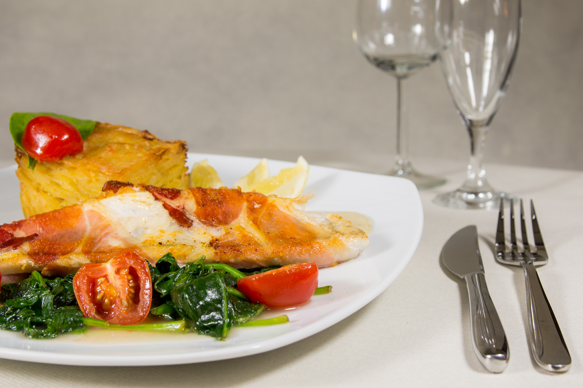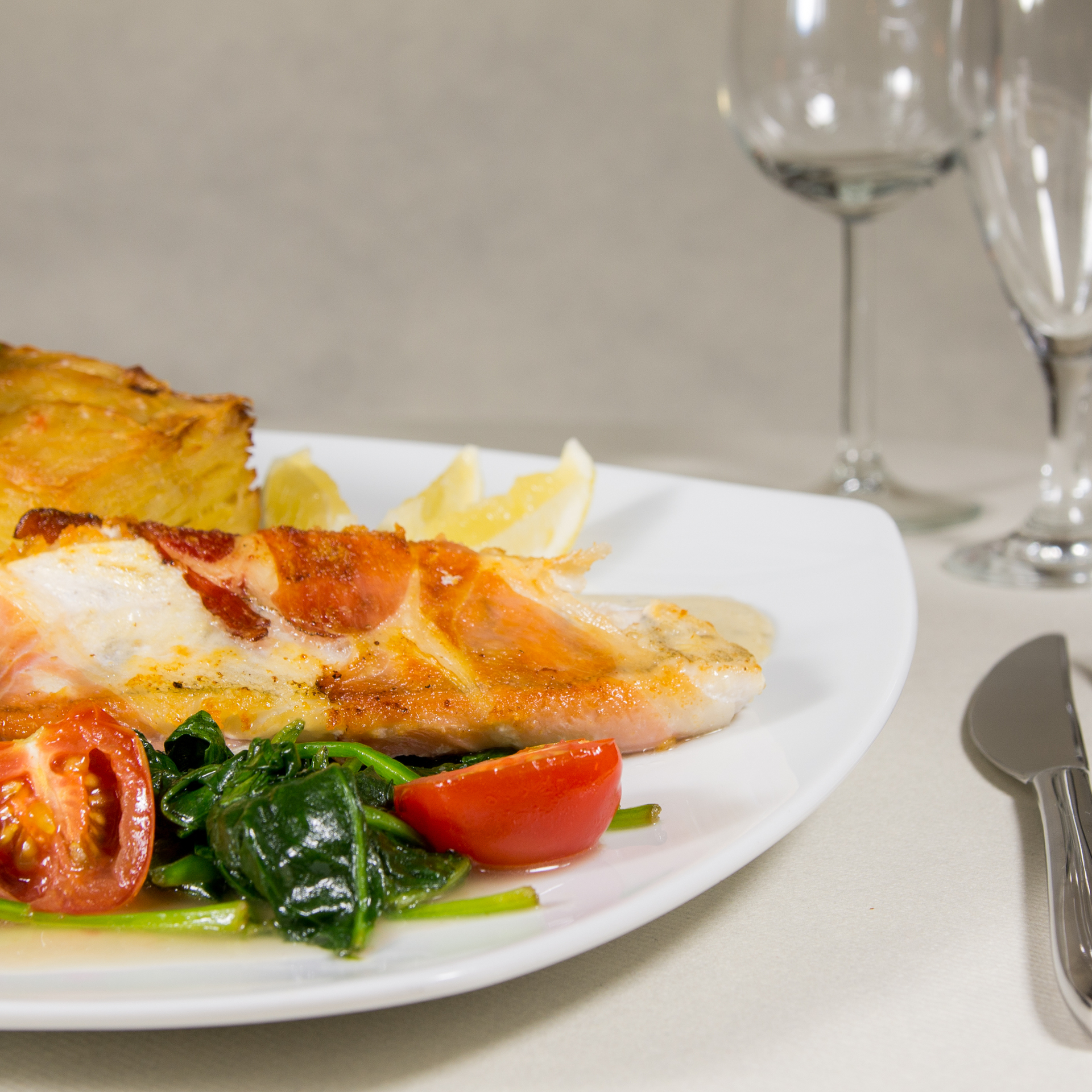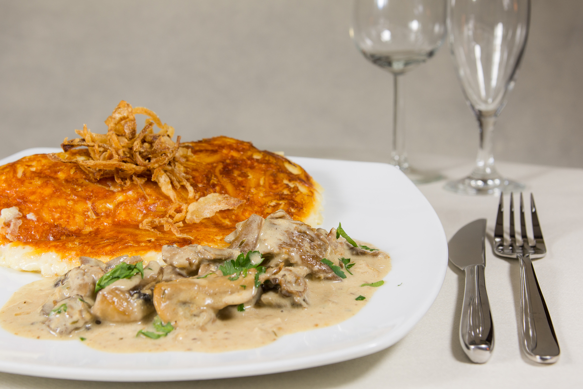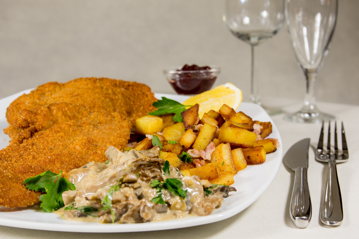| Wiener Schnitzel vom Kalb mit Bratkartoffeln, Zwiebeln und Speck mit extra Pilzragout (auf Wunsch mit Preiselbeeren) | 26,50€ 29,50€ | ||