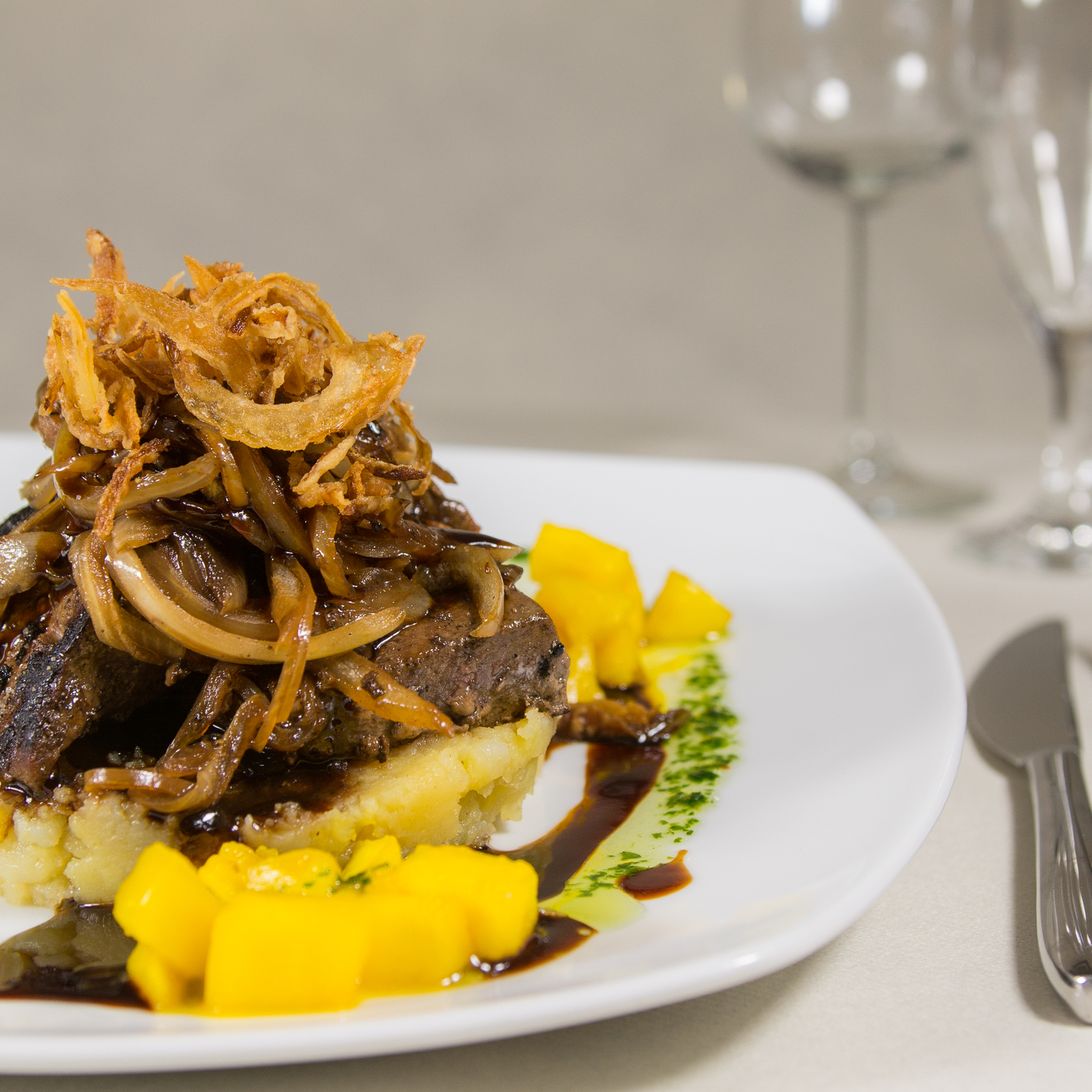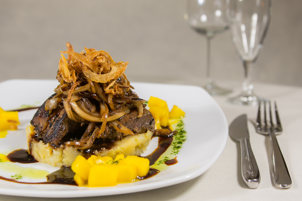 | Berliner Kalbsleber mit Apfel, Zwiebel, Kartoffelstampf, Röstzwiebeln und Leberjus | 23,00 € | ||